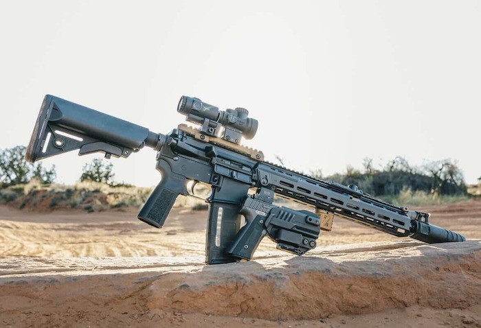 Its upper receiver is paired with a standard lower, while the fire controls are positioned in line with those found on M4-style rifles.